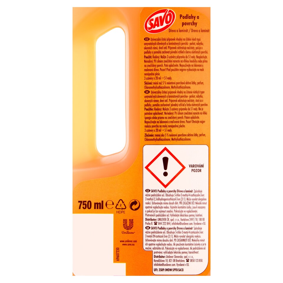 Použitie: Riedený: Nalejte 3 uzávery prípravku do 5 l vody. Nie je potrebné oplachovať. Neriedený: Pri silnom znečistení naneste na vlhkú špongiu alebo priamo na znečistený povrch. Potom opláchnite. Nepoužívajte na lakované a maľované drevo. Pozor! Otestujte najprv reakciu povrchu na malej nenápadnej ploche.3 uzávery x 20 ml → 5 l vody.